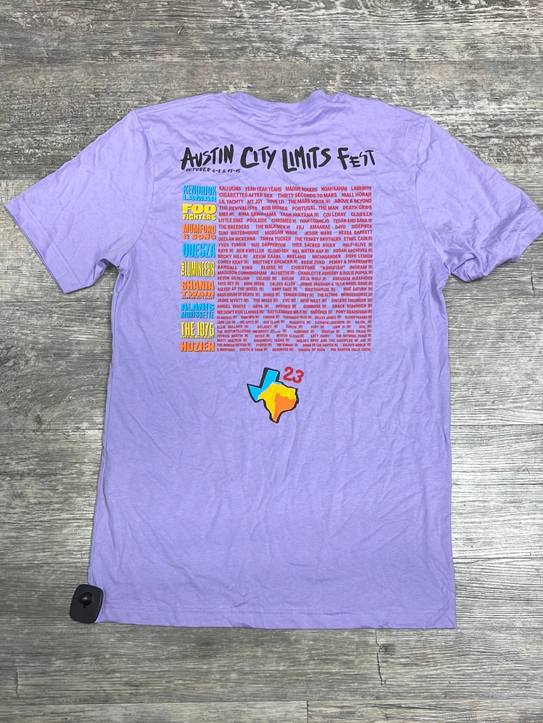 Gently used printed tee with graphic print on front and Austin City Limits Music Festival 2023 artist lineup printed on back